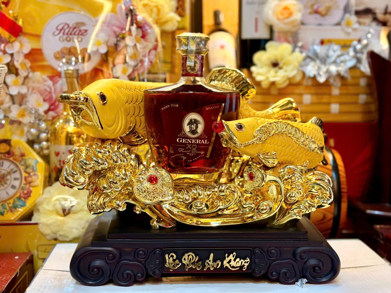 Cá Ngân Long xi mạ vàng : Lộc Phúc An Khang Xuất xứ: Brandy XO Pháp ( Extra Old ) Nồng độ: 40% vol Dung tích: 700ml