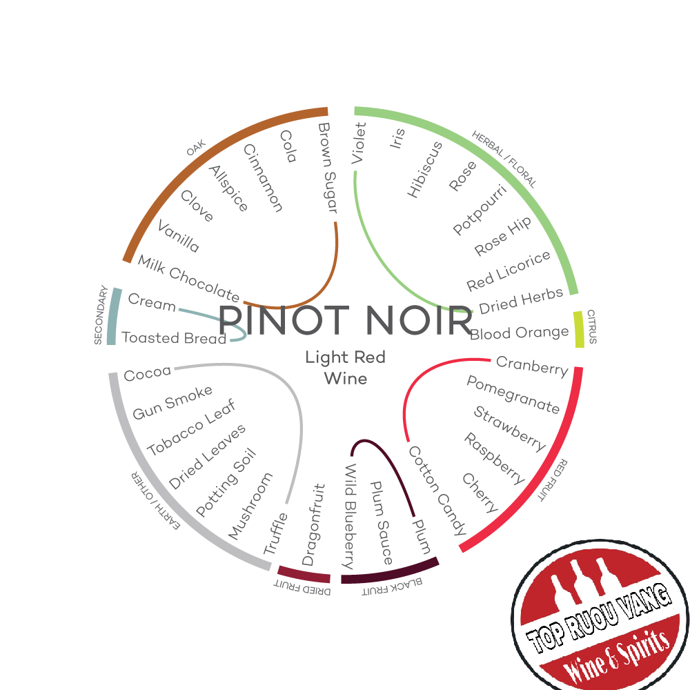 - Trong rượu vang đỏ có mùi với họ quả mọng đỏ ( Red Fruits ) như : mạn việt quất (Cranberry ), quả lựa , quả lý chua , anh đào , dâu tây , phúc bồn tử , mận đỏ , thanh long ….vv thuộc nhóm vang đỏ vừa và nhẹ là mùi của giống nho Pinot Noir , Grenache , Sangiovese , Merlot.