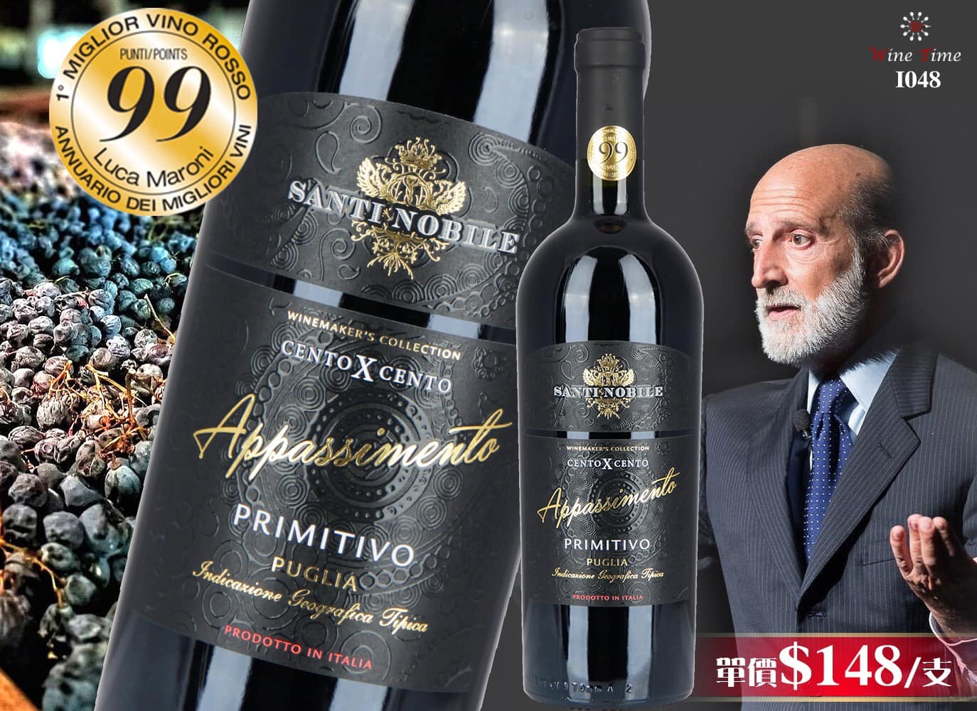 Rượu vang Santi Nobile Cento X Cento Appassimento Primitivo 99 điểm. Được làm từ nho tốt nhất ở Ý, trồng ở những vùng trồng nho nổi tiếng nhất. Được đánh giá bởi sommerlier hàng đầu Italia là Luca Maroni.