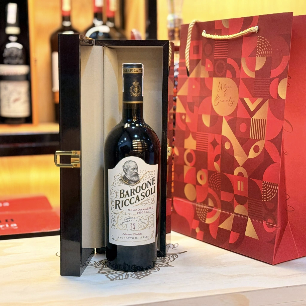 Từ những vườn nho Negroamaro trứ danh của vùng Puglia, Baroone Riccasoli mang đến tuyệt tác rượu vang phiên bản giới hạn – nơi hương vị mạnh mẽ giao hòa cùng sự tinh tế Ý cổ điển.