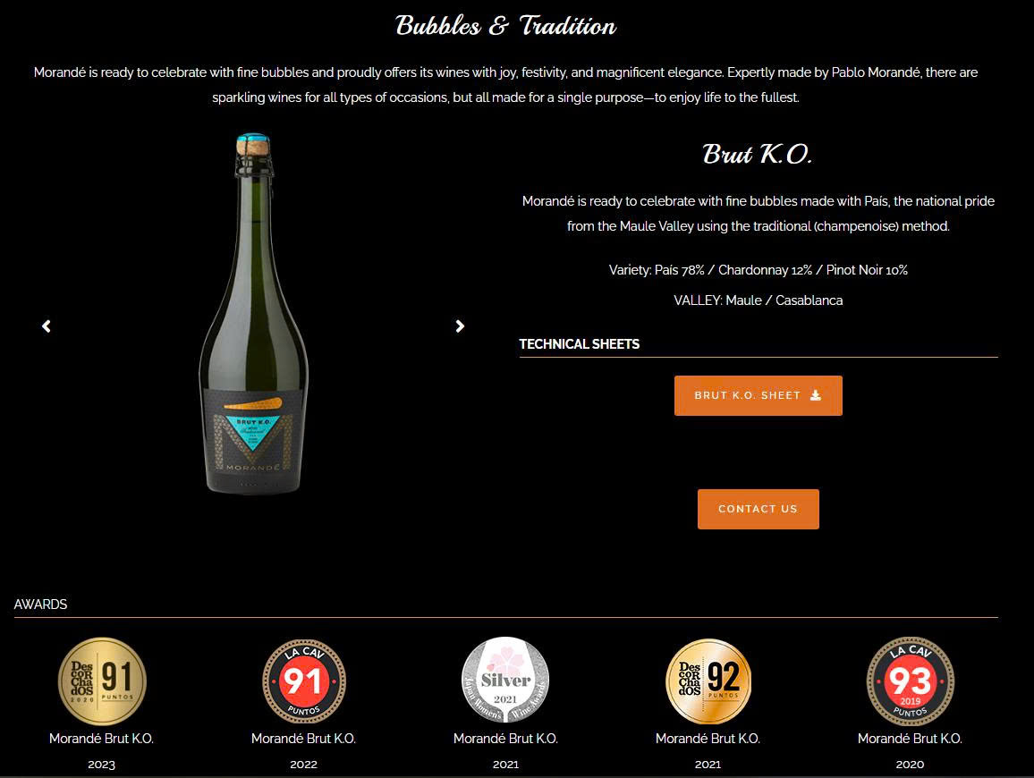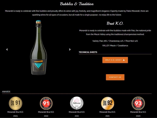 ** Morande của chúng tôi tự hào giới thiệu đến bạn dòng rượu vang Morande Brut K.O. đã được hội đồng nếm thử của tạp chí La Cav, Descor Chados chấm 91-92-93 điểm.