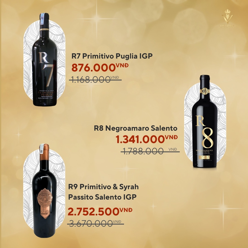 Rượu vang R9 là loại rượu vang rất đặc biệt được tạo ra từ nho Primitivo tuyệt vời. Rượu vang này mang lại cho bạn hương vị quý phái (mùi da thuộc) hương trái cây đỏ và hương vị giấm balsamic, gỗ Bá Hương, gỗ Tuyết Tùng, mùi gia vị, mùi hoa quả chín, …làm nổi bật cấu trúc và tính phức hợp của vang.